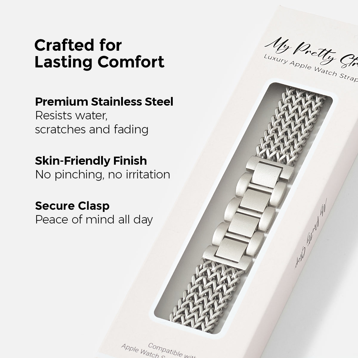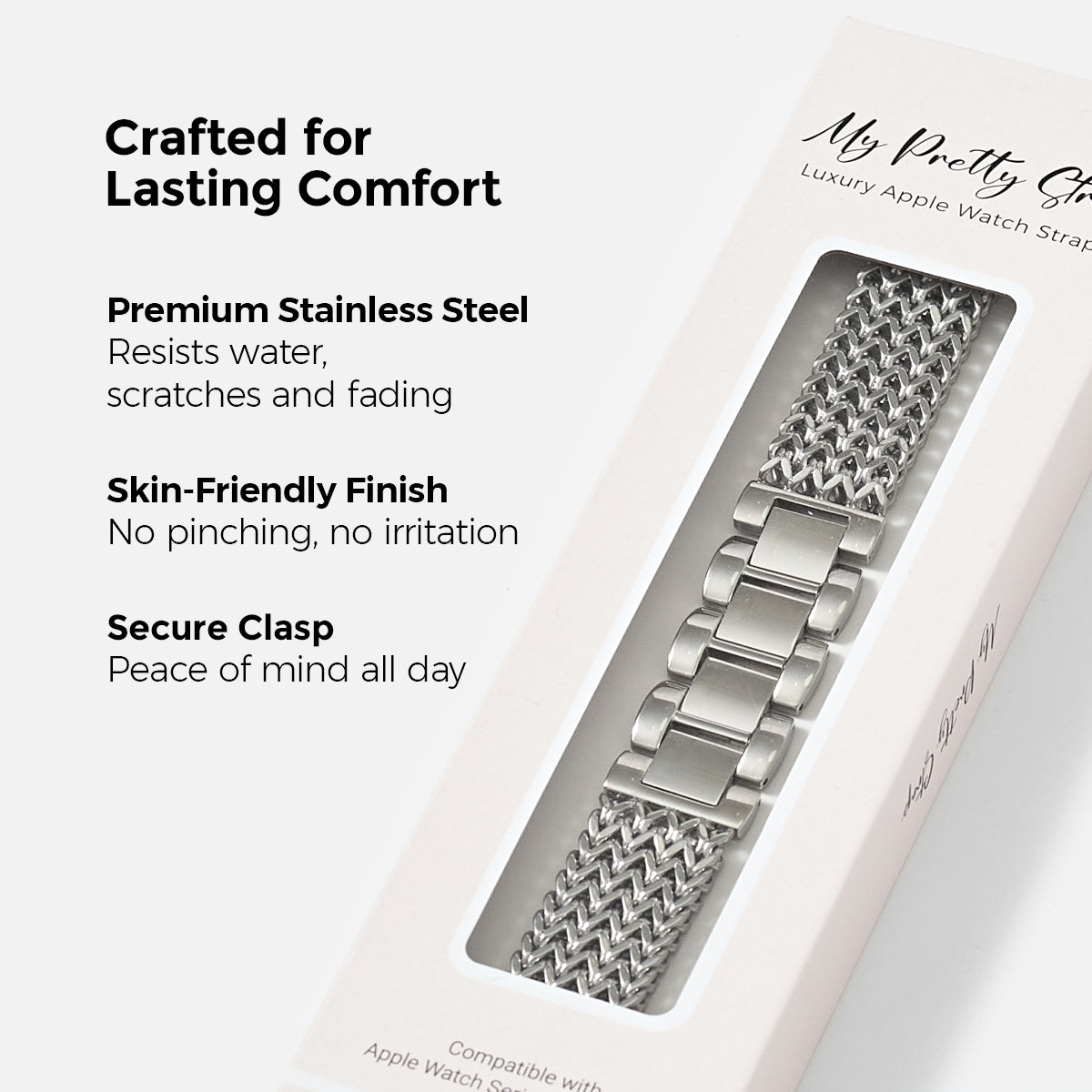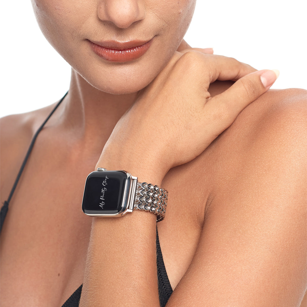Crafted from premium stainless steel and twisted into elegant foxtail chains, this watch band elevates your Apple Watch with its luxurious look & feel. Each watch band was designed to fit your Apple Watch seamlessly straight from the box.